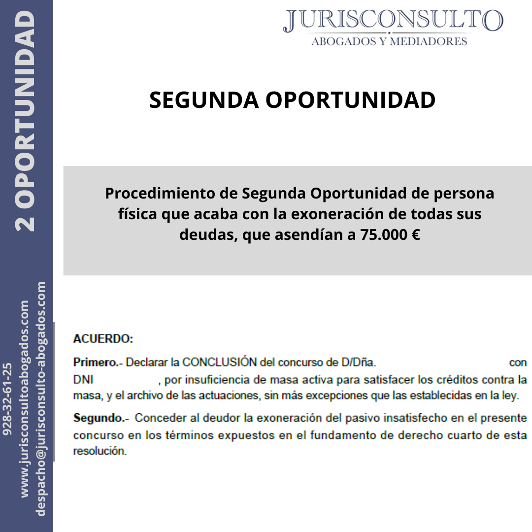 Consiguiendo la exoneración de toda su deuda a través de procedimiento de segunda oportunidad seguido en los Juzgados de lo Mercantil de Las Palmas de Gran Canaria».